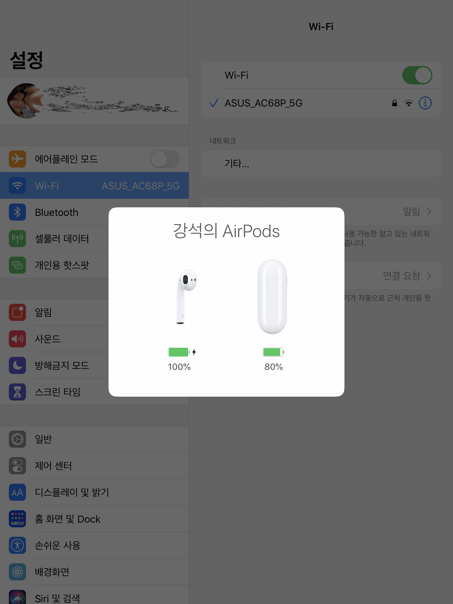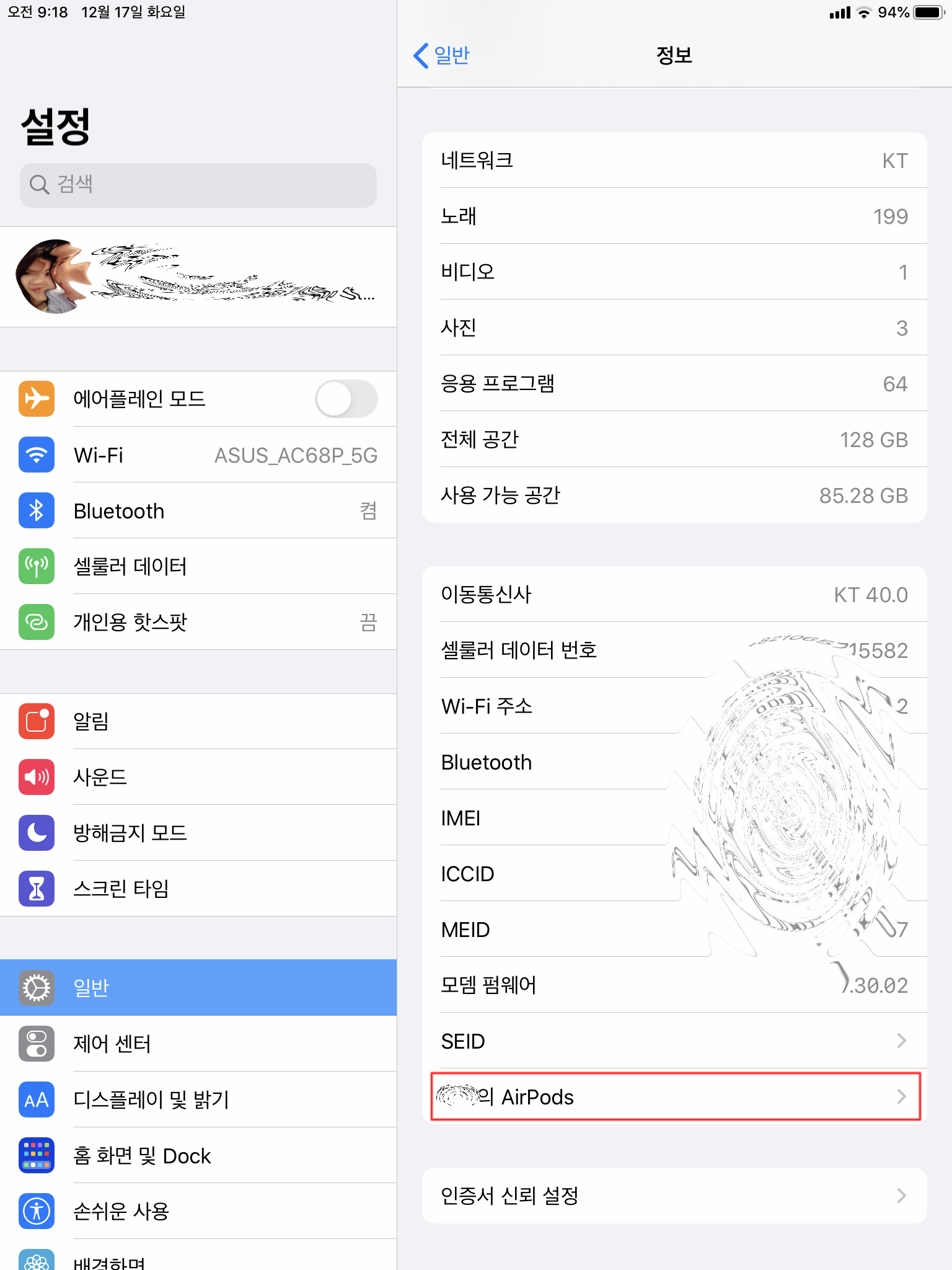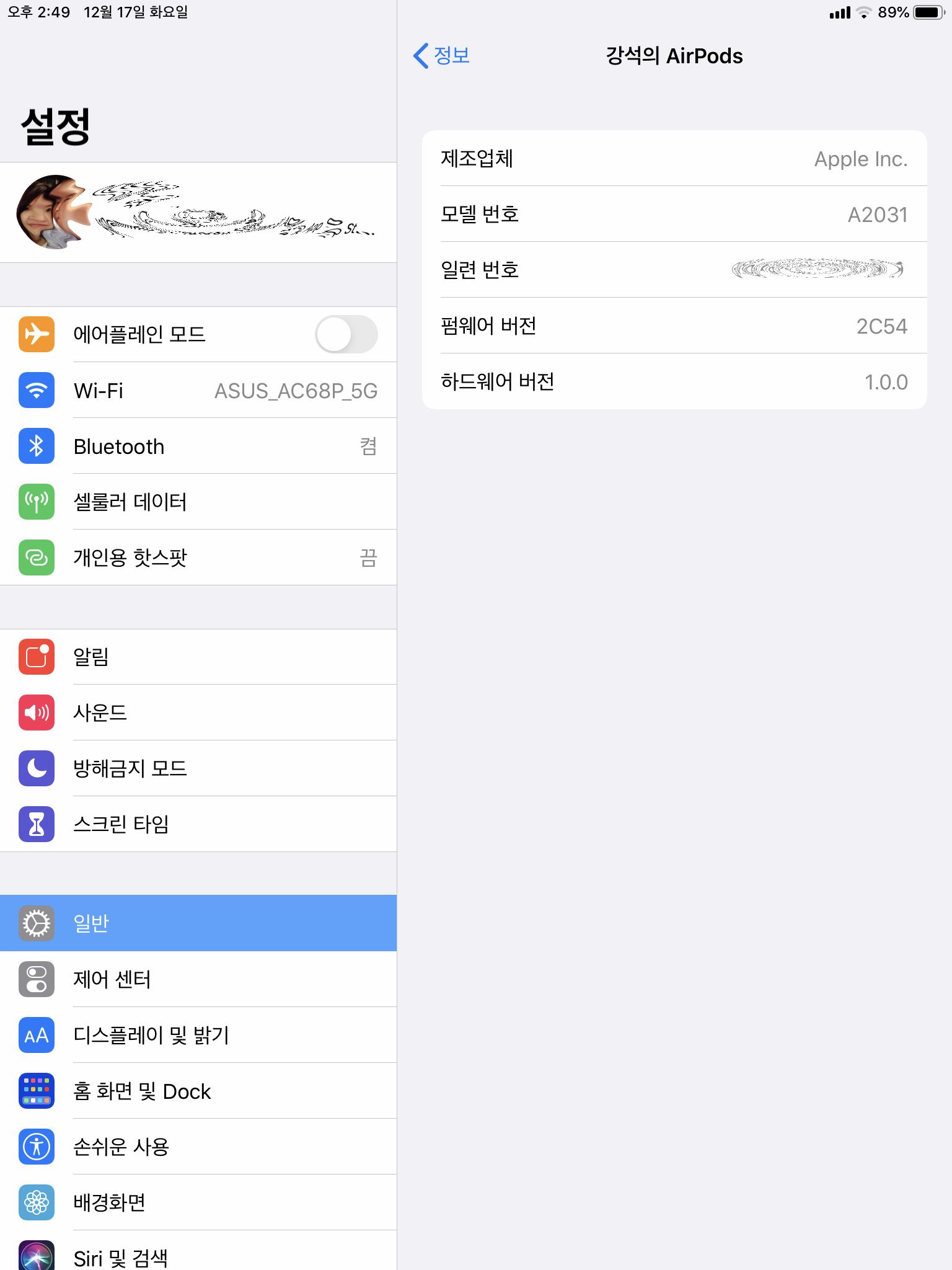 2. 뚜껑을 열어놓으셨다면 설정 > 일반 > 하단에 보시면 자신의 AirPod 항목이 보이는데 이 항목을 눌러줍니다.